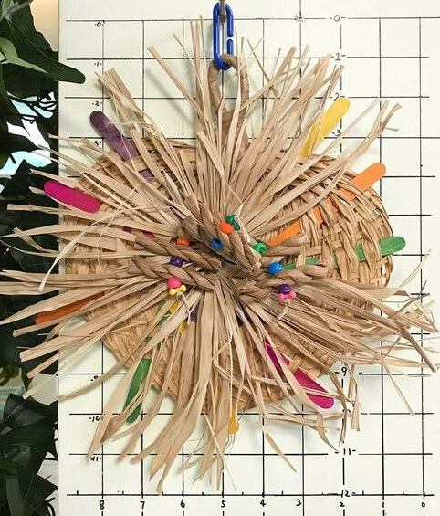 This handcrafted toy is centered on a large woven palm fan, strings of soft raffia fibers wildly sticking out, and adorned with colorful plastic and wooden bits. It looks like an exotic flower to your curious bird. This toy is excellent for foraging, and your bird can safely hang on it as they seek out hidden treasures! |