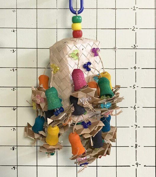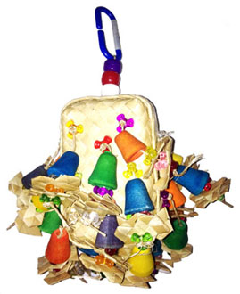 | It's a treasure chest full of surprises for your feathered companion! Hung outside this enticing foraging toy are clusters of wooden bells, shredder papers and shiny plastic tribeads, all threaded together by manila hemp strings. Such a dazzling object will surely be hard to resist! |